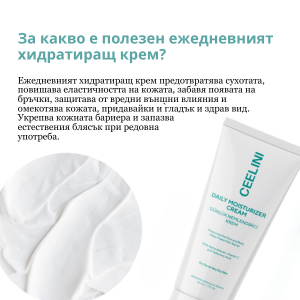CEELINI Daily Moisturizer Cream е лек, интензивно подхранващ крем, създаден да осигури оптимална хидратация и дълготрайна защита през целия ден. Благодарение на активната комбинация от Хиалуронова киселина, витамини и растителни екстракти, той изглажда текстурата на кожата и възстановява нейната мекота и естествен блясък.