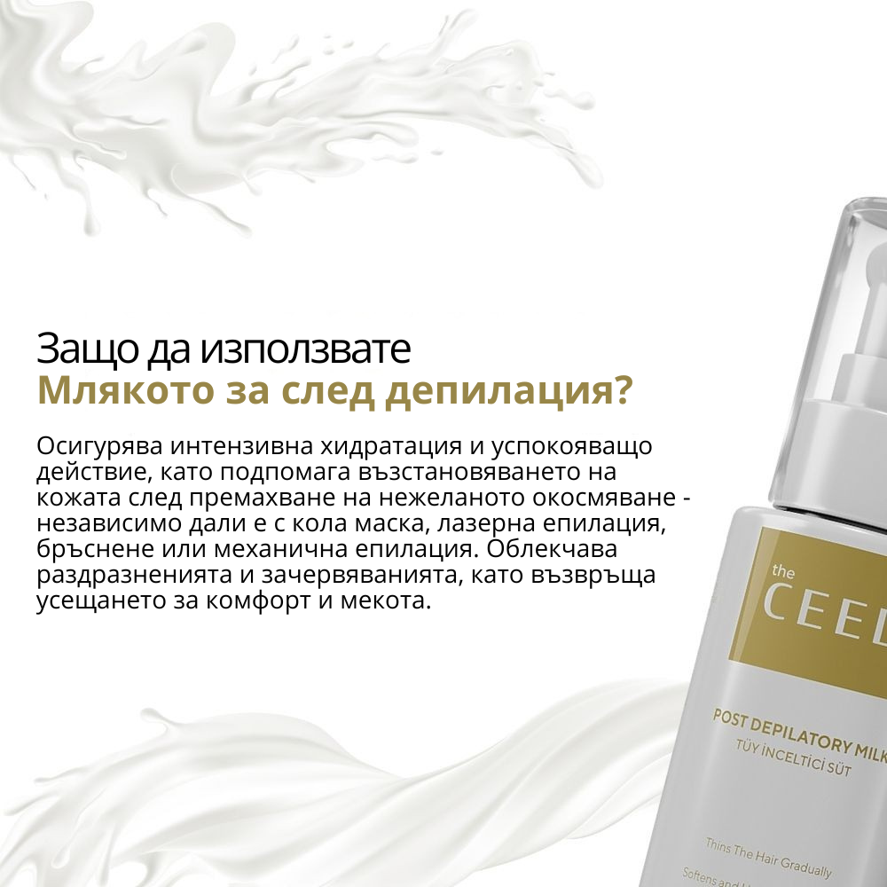 The Ceel Post-Depilatory Milk е специално разработено мляко за тяло, създадено да възстанови комфорта на кожата след депилация, кола маска или лазерни процедури. Леката и немазна формула хидратира в дълбочина, успокоява раздразненията и подпомага регенерацията на кожата. Съдържа успокояващ екстракт от Коприва, хидратиращ Глицерин и пропилен гликол, както и натриев хиалуронат – мощен овлажнител, който възстановява еластичността и мекотата на кожата.