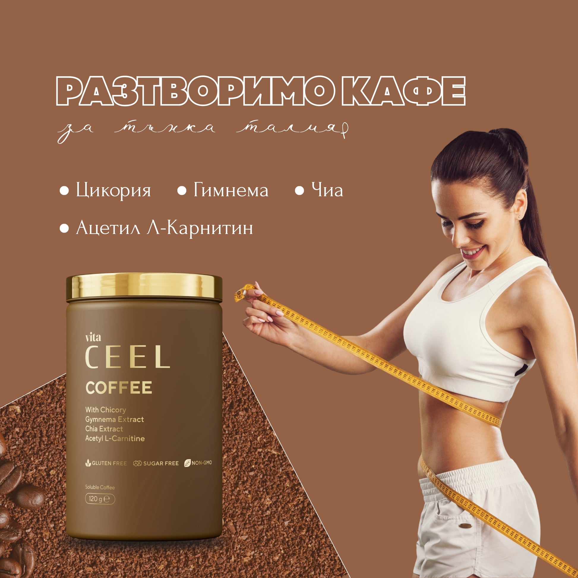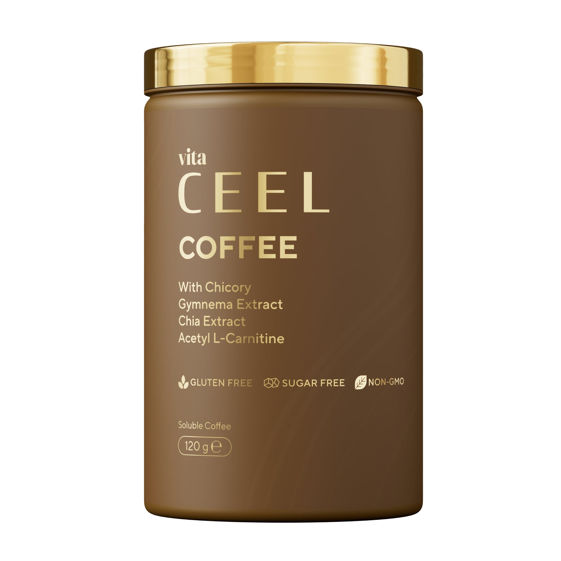 Vita Ceel Coffee комбинира разтворимо кафе с екстракт от хиндиба (Chicory) - естествен източник на инулин, който действа като пребиотик, Gymnema sylvestre - растение, известно със свойството си да регулира апетита и желанието за сладко, екстракт от чиа - богат на омега-3 и фибри, и Ацетил L-Карнитин, който подпомага енергийния метаболизъм и изгарянето на мазнини.