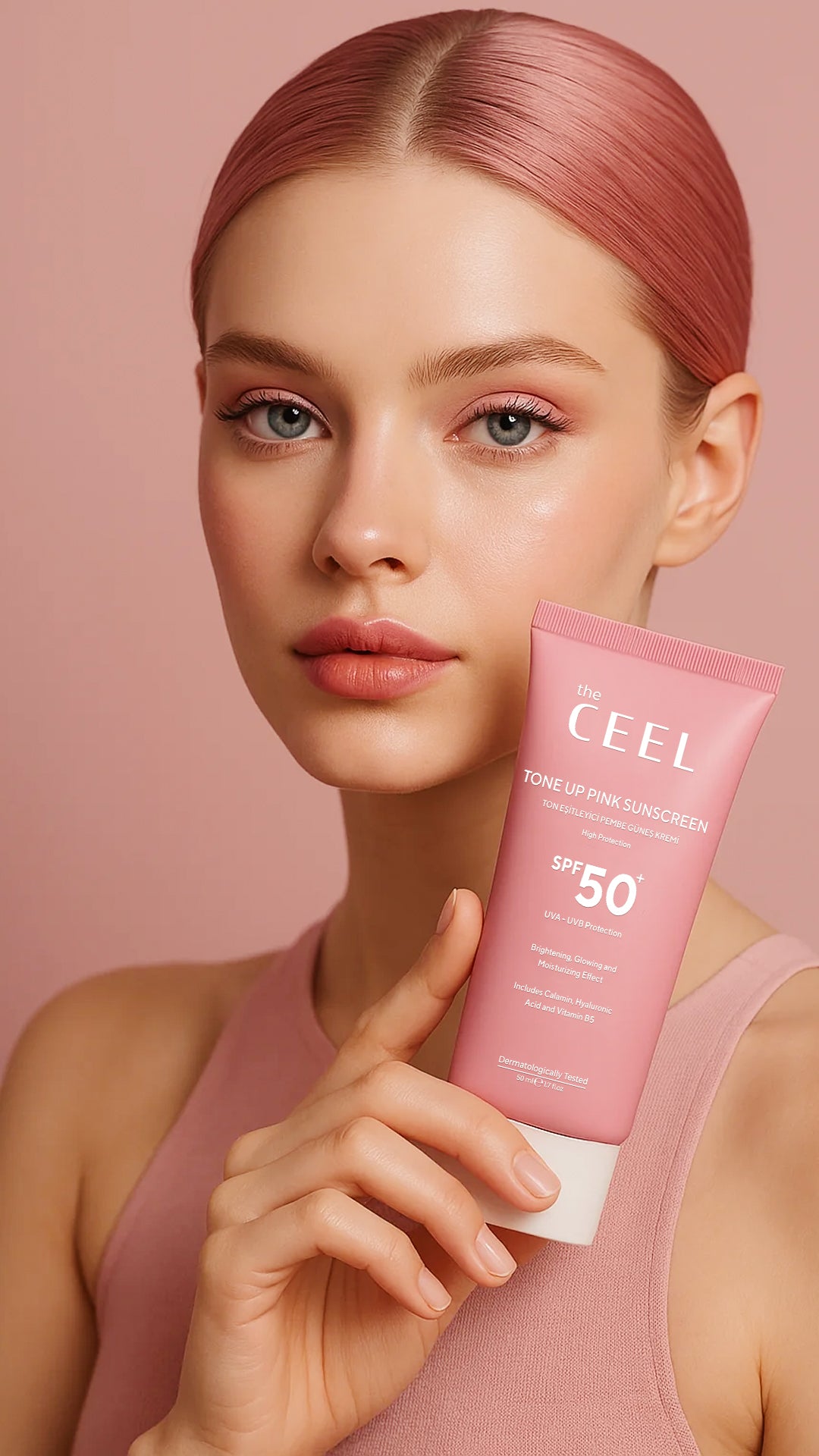 The Ceel Tone Up Pink Sunscreen SPF50+ съчетава висока UVA/UVB защита с моментално озаряване и изравнен тен. Формулата с SPF50+ предпазва от фотостареене, пигментни петна и дехидратация, докато розовият тон прикрива бледия вид и придава свежо сияние.