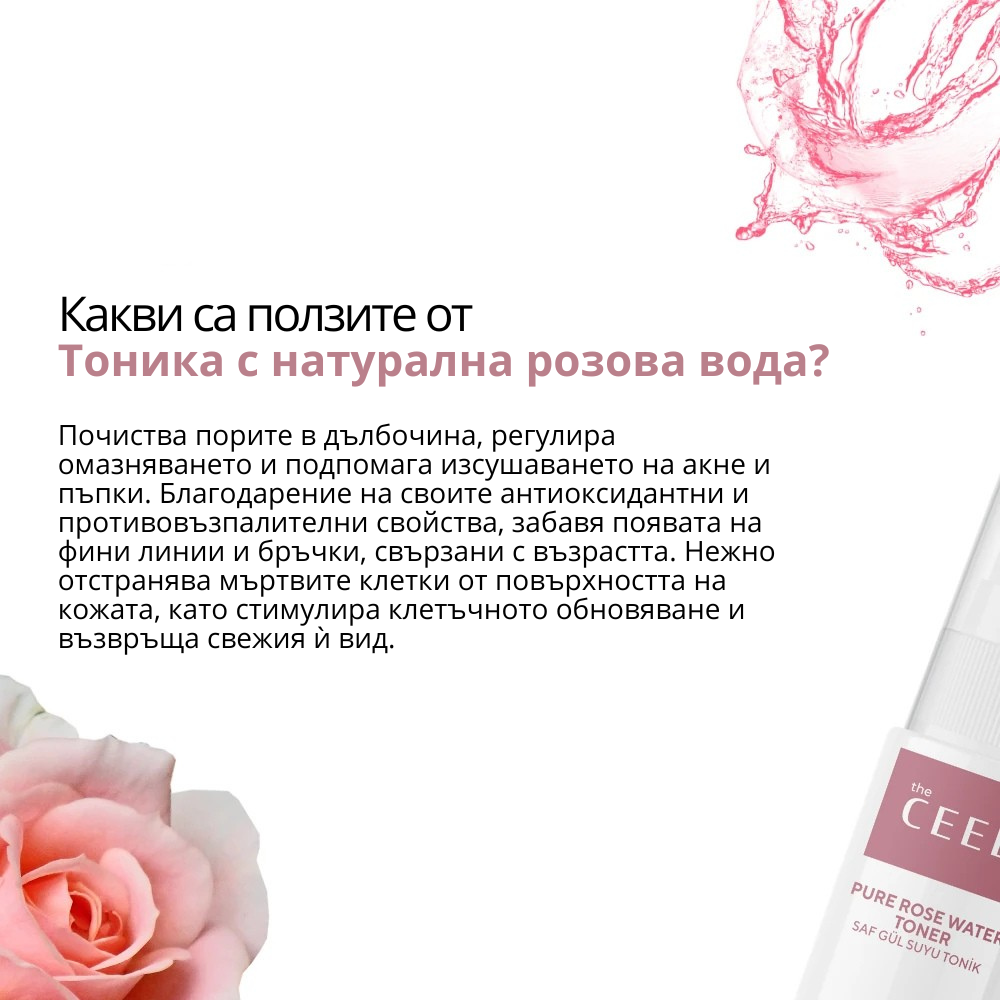 The Ceel Pure Rose Tonic е перфектен за чувствителна и раздразнена кожа. С 100% натурален състав и флорална вода от Rosa Damascena, той възстановява pH баланса, овлажнява в дълбочина и успокоява кожата. Подходящ за всеки тип кожа – за сияен и освежен вид, без излишни съставки.
